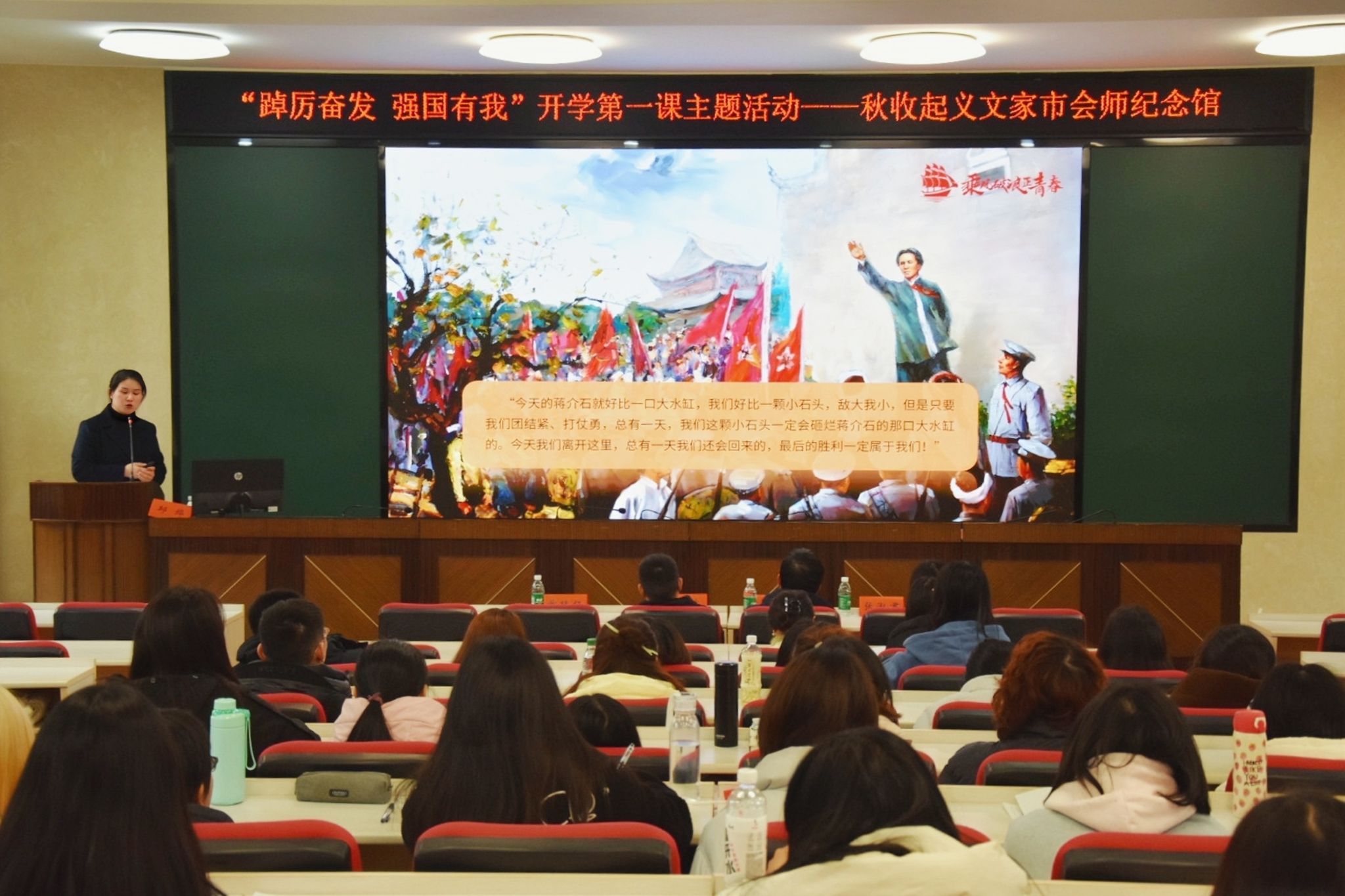 在党课开始之前,邱烨通过视频介绍和提问,向大家引出了党课主题——毛泽东在浏阳。随后,邱晔从三个不同部分诠释主题。第一部分以“毛泽东的浏阳印记”为题,围绕寻找新出路、开辟新道路和走向新胜利三个不同阶段,向大家具体讲述了毛泽东同志在浏阳的革命经历。第二部分的主题是“青年人该有的样子”,邱烨从毛泽东同志的革命经历过渡到青年的成长,向青年人提出做不负韶华的有志青年、做吃苦奉献的有德青年和做奋斗担当的有为青年的展望。第三部分“新青年的历史使命”则由历史走向现实,为大家指明奋斗目标,最后在邱烨的带领下,全体党员进行了宣誓。