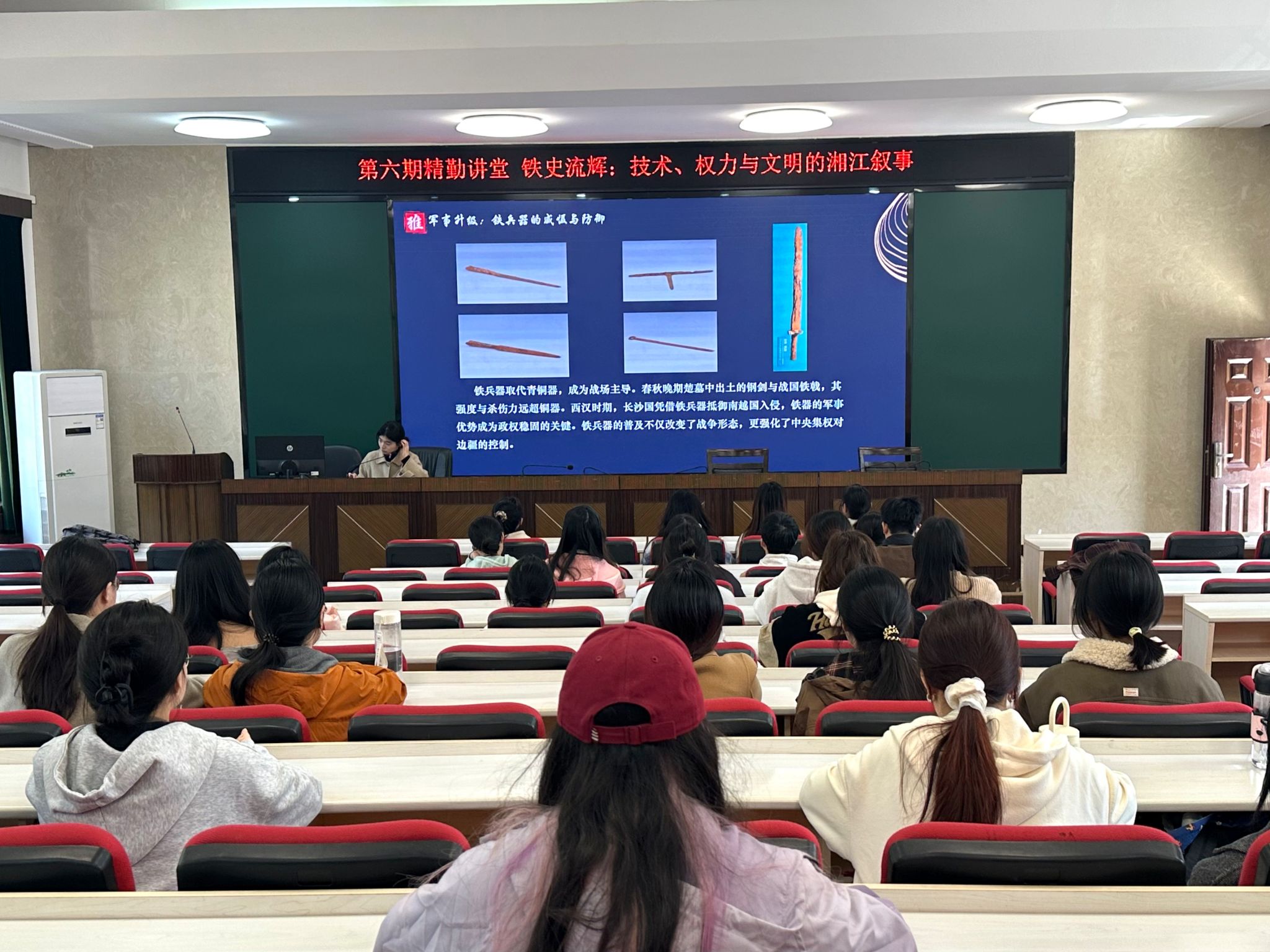 此次讲座围绕湘江流域铁器技术这一核心议题,两位主讲人从技术演进、社会影响以及现代启示三个维度对其进行阐述。讲座伊始,张星雨结合湘江流域铁器技术的相关考古资料,以“陨铁的使用到生铁铸件的诞生”为线索,为同学们梳理湘江流域铁器技术的发展脉络,生动展现了冶铁技术的起源与革新。随后,游子萱结合实例进一步向同学们介绍古人如何运用铁器促进生产力变革,并倡导同学们从中汲取经验,深入思考技术创新与社会变革之间的内在关联。