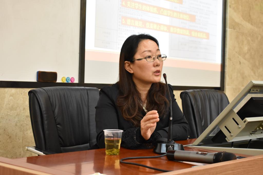 黄敏兰从大学生教学技能大赛引入,从五个方面简要分析了教学设计和片段竞赛的要求。在分析过程中,她着重谈到大学生在片段教学中所表现出来的缺陷不足,一是研读标准不细致;二是教学内容和方法处理较僵化,她指出大多数学生在片段教学中会小组讨论和自主探究模式上耗费过多时间,这种模式在片段教学中是不可取的;三是教学辅助手段运用有待改进。黄敏兰进一步以具体现实的片段教学竞赛事例分析,为同学们详细讲解了改进方法,她认为在学生可以提高教学板书的设计感以及在PPT制作上做到更加精美简洁以增强片段教学的可观性。