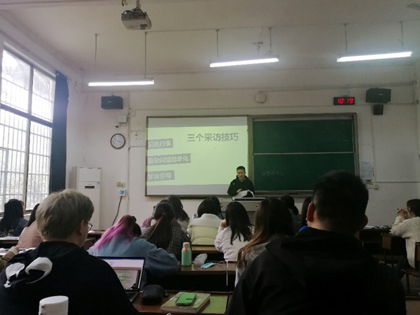 (通讯员 苑文楠)2021年4月13日上午,潇湘晨报记者满延坤走进新闻学基础课堂,为2019级文化产业管理班讲授新闻采访。