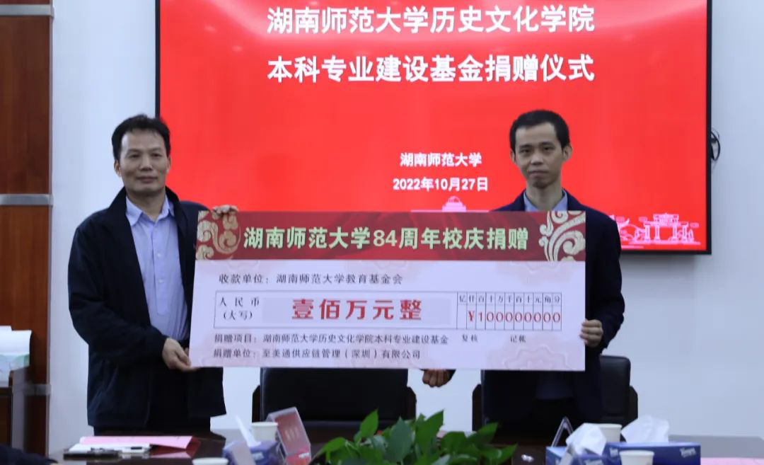 至美通供应链管理(深圳)有限公司是由我校太阳成tyc7111cc2008级校友张昊铱先生和徐益先生联合创办的企业,是专业的跨境电商本土化一站式解决方案提供商。徐益发表捐赠感言,他回顾自己一路成长、创业的经历,感恩母校的培育和关怀。而今恰逢毕业十周年,他和昊铱希望尽己之力回报母校,为母校生日献礼。