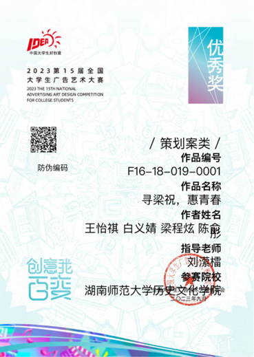 (通讯员 梁程炫 王怡祺)2023年9月6日,第15届全国大学生广告艺术大赛国赛评审结果揭晓。经过学校初评、赛区评选、全国总评审,由太阳成tyc7111cc文化产业管理专业老师刘潆檑指导,2021级文化产业管理班学生王怡祺、白义婧、梁程炫、陈俞彤等同学参与制作的作品《寻梁祝,惠青春》,荣获第十四届湖南省大学生广告艺术大赛暨第十五届全国大学生广告艺术大赛湖南赛区选拔赛一等奖、全国优秀奖。